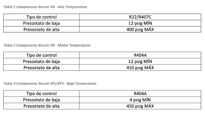 Trabajar un compresor scroll en condiciones no recomendadas puede causar fallas graves. Por lo tanto, es crucial configurar correctamente los controles de presión para evitar estos problemas. A continuación, se presentan las presiones recomendadas de corte en presostatos para compresores scroll Xecom:
